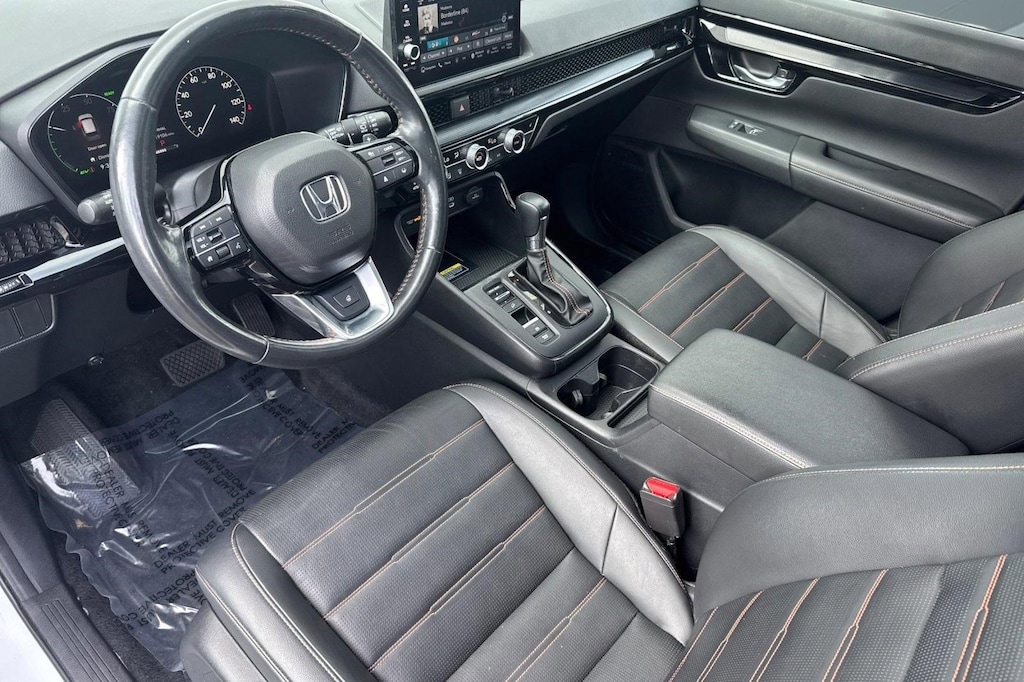 ONE OWNER, CLEAN CARFAX, 2024 Honda CR-V Hybrid Sport Touring, All Wheel Drive, Moonroof, Automatic Headlights, Bluetooth Connection, Heated Front Seat(s), Hands-Free Liftgate, Leather Seats, Remote Engine Start, Blind Spot Monitor, Cross-Traffic Alert, Rear Collision Mitigation, Lane Departure Warning, Lane Keeping Assist, Back-Up Camera, White exterior, and Black interior.